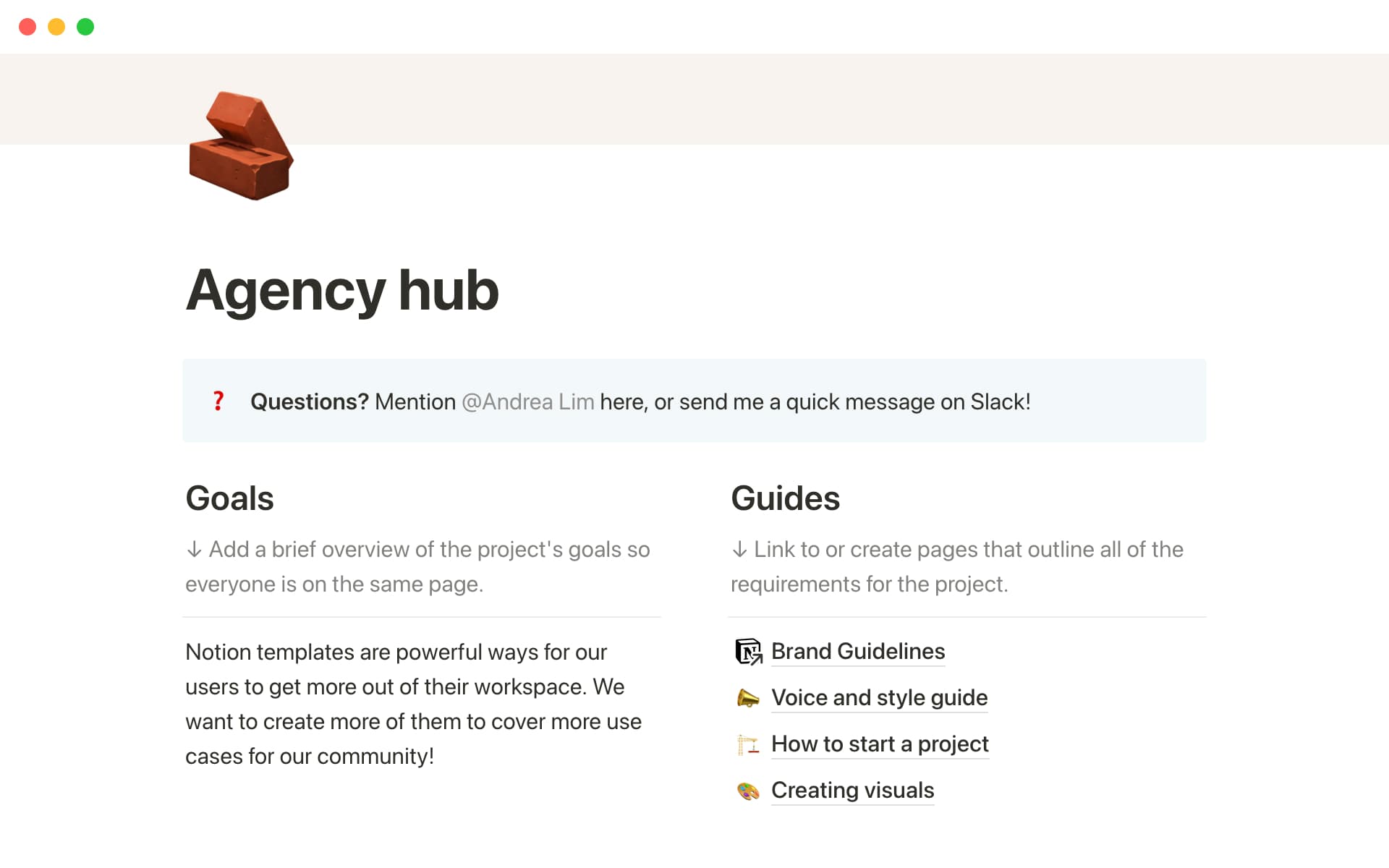 We get a lot of help from amazing contractors and agencies — instead of wading through hundreds of emails and Google Drive links, we build a Notion homepage for each one where we do all our work.