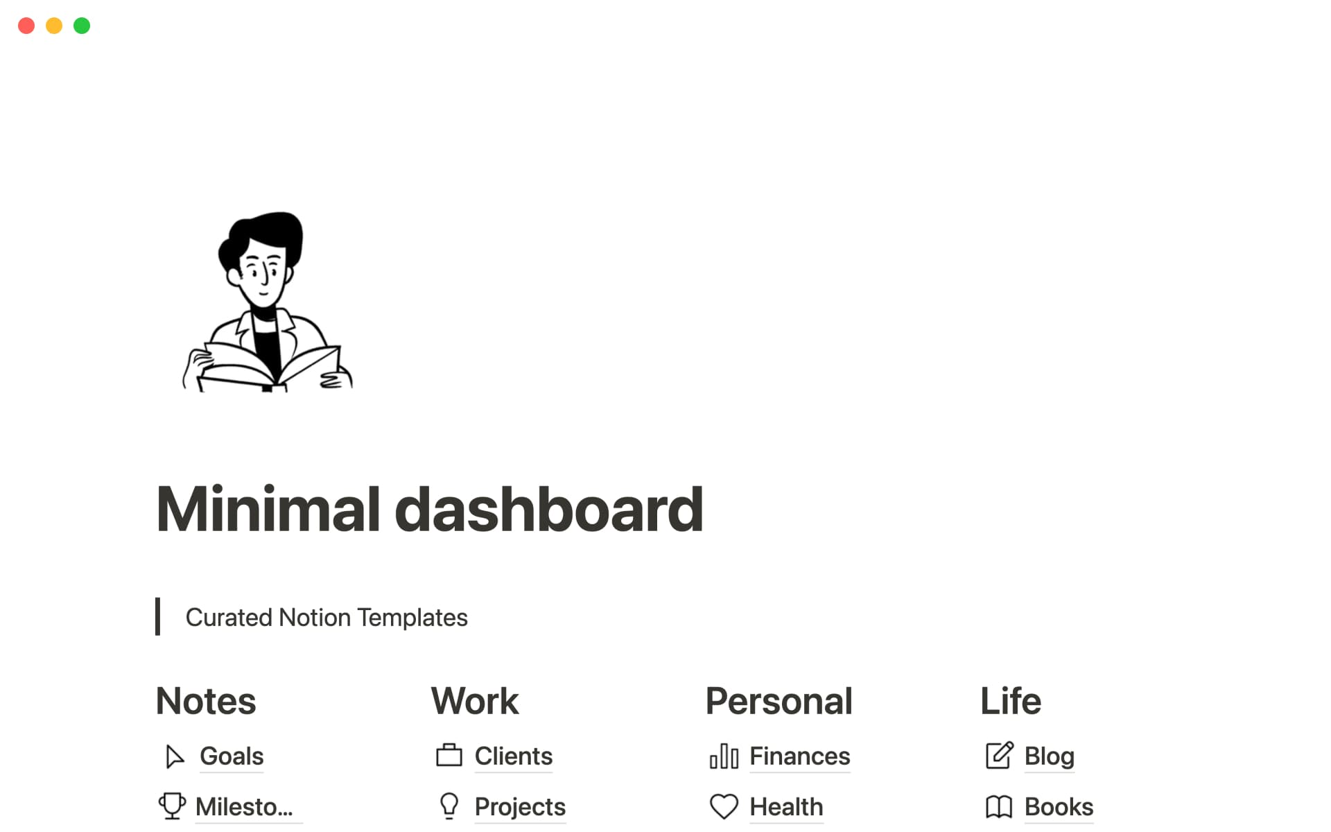Having one place to house your projects, notes, and goals is key to staying organized in everything you do. But building a dashboard for yourself doesn't have to be complicated or overwhelming. Use this template as inspiration for categorizing the different areas of your life, then watch your new digital home grow with you over time. It's easy to add sections or subpages for your specific topics of interest too — that new knitting hobby of yours definitely deserves its own space.