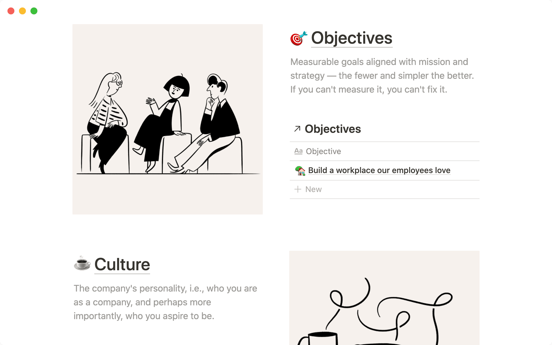 Under every section, you can add text, bullet points, or even embed your OKRs database like above. If folks want more info about each objective, they can click into the database.